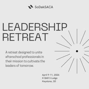 Upcoming Events Events Search and Views Navigation Show Events Search Events Search Events From Search Near Event Views Navigation View As ListMonthWeekDayMapPhoto « Previous Events February 2026 Afterschool Day at the Capitol – Register Now! February 3 Find out more » March 2026 SAVE THE DATE! NAA26! March 11 - March 14 Find out more » April 2026 SoDakSACA Leadership Retreat April 9 - April 11 K Bar S, Keystone, South Dakota, 434 Old Hill City Road Keystone, SD 57751 United States + Google Map Find out more » October 2026 SAVE THE DATE! SoDakSACA’s Annual Conference October 8 - October 10 Find out more » + Export Events Search for: Recent News Class of 2025 Next Generation of Afterschool Leaders Upcoming Events Tue 03 Afterschool Day at the Capitol – Register Now! February 3 Mar 11 SAVE THE DATE! NAA26! March 11 - March 14 Apr 09 SoDakSACA Leadership Retreat April 9 - April 11 View More…
