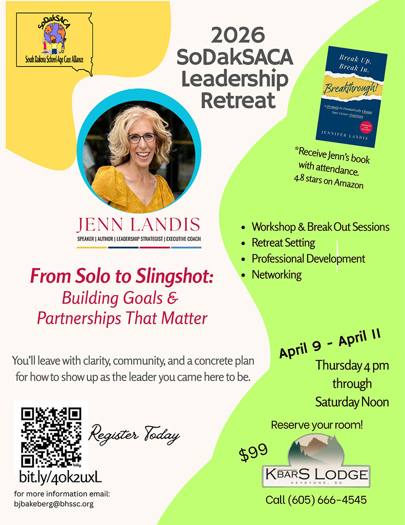 Services in the spring of each year as a spring training enhancement to the annual fall SoDakSACA conference. OST directors and lead management staff attend the Retreat to network, re-energize, and learn new management and leadership skills. This conference provides a great opportunity for recruitment of new SoDakSACA members.